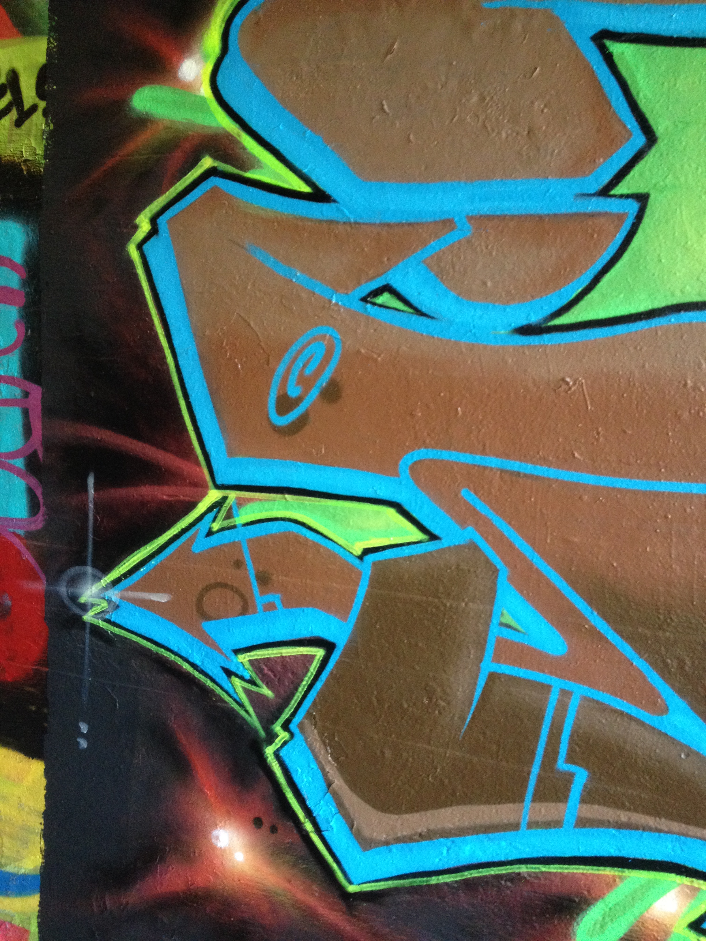 Meanwhile, I’m back to New England meat-and-potatoes for this frill-free copper-chrome burner with a high-pressure fill-in. I like my outlines super-skinny with minimal cutbacks and most writers will tell you that metallics are unforgiving when it comes to flashing after a fix-up. The white orbs provide some depth (I hope), and the weather-worn and paint-peeled texture of the wall comes to the forefront bathed in a chrome-coat.