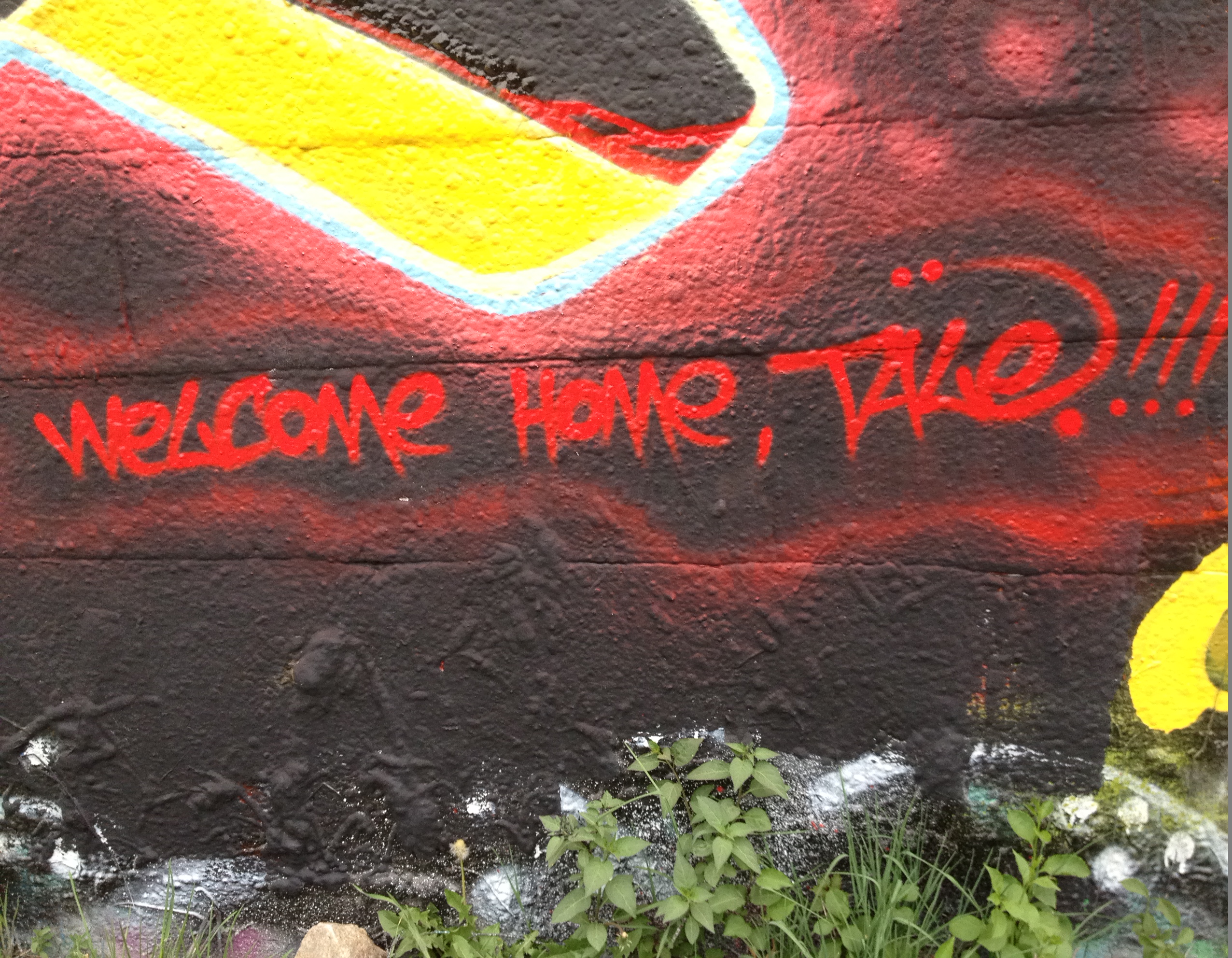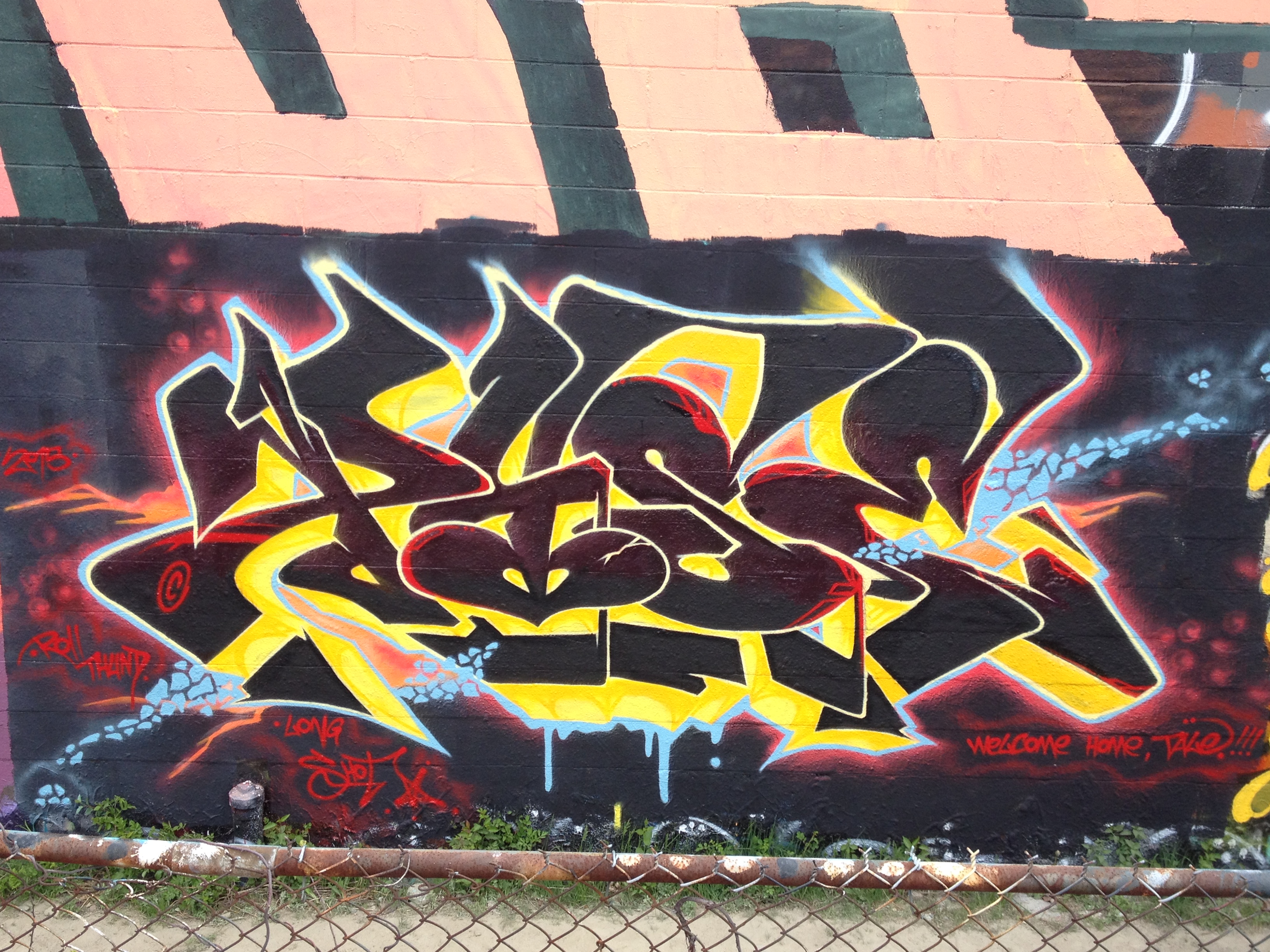 Pyse117 celebrates his healthy, happy, and safe return to the North Shore of Massachusetts with a fresh Burner and a big Welcome-home to inexplicable, irrepressible, unemployable Talerock86. This little beauty features a deep-mauve-to-flat-black fill-in with an Easter-yellow (Montana Goldline) outline, Dayz-yellow (Plutonium) 3-d, and highlights in Madrid-red (MTN Hardcore). The theme here is the successful navigation of an asteroid field painted in Barcelona-blue (MTN 94). Still sizzling from the strength of the Florida sun, Pyse cools out in the frigid darkness and peaceful isolation of his home-nebula in the deep-space-Cape.